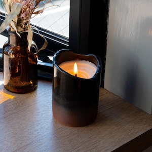使用していくにつれて徐々に黒みがかっていく様子や蝋燭の火が内側で照り返す様子からは、陶器ならではの偶発的な美しさが感じられます。