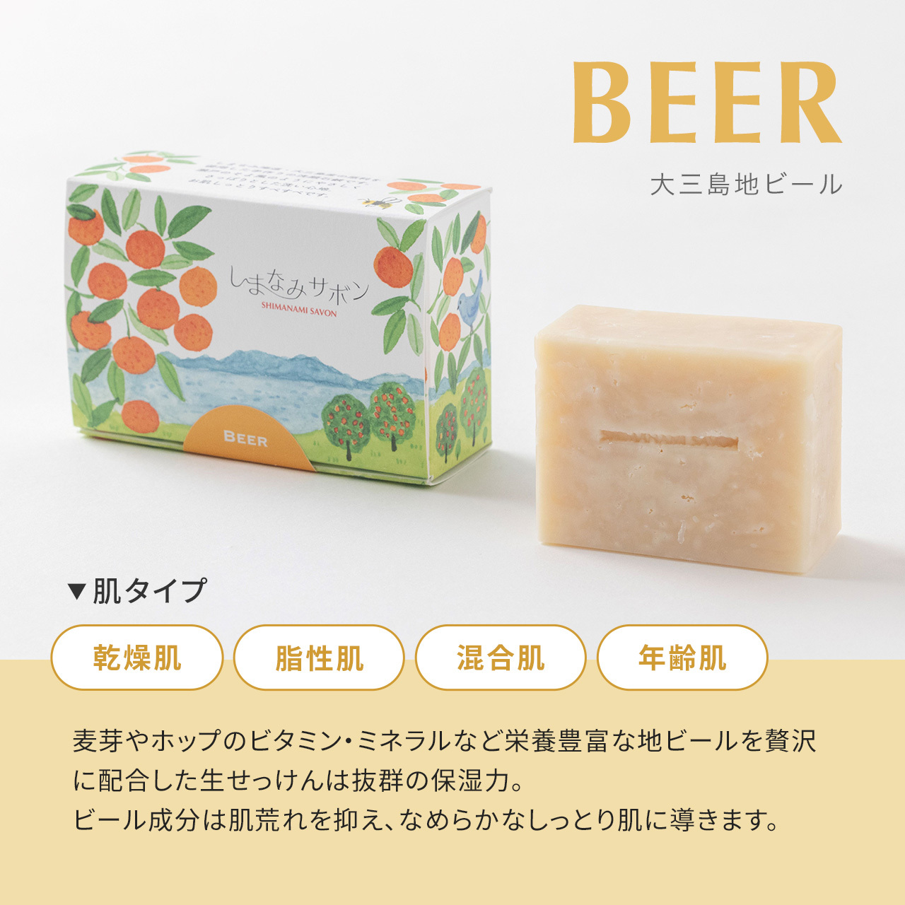 軽やかで芳醇な地ビールの香り。麦芽やホップのビタミン・ミネラルなど栄養豊富な地ビールを贅沢に配合した生せっけんは抜群の保湿力。ビール成分は肌荒れを抑え、なめらかなしっとり肌に導きます。島の美味しい地ビール醸造所【大三島ブリュワリーさん】のペールエールを配合したお肌に優しい生石鹸です。乾燥肌や肌荒れでお悩みの方へおすすめです。