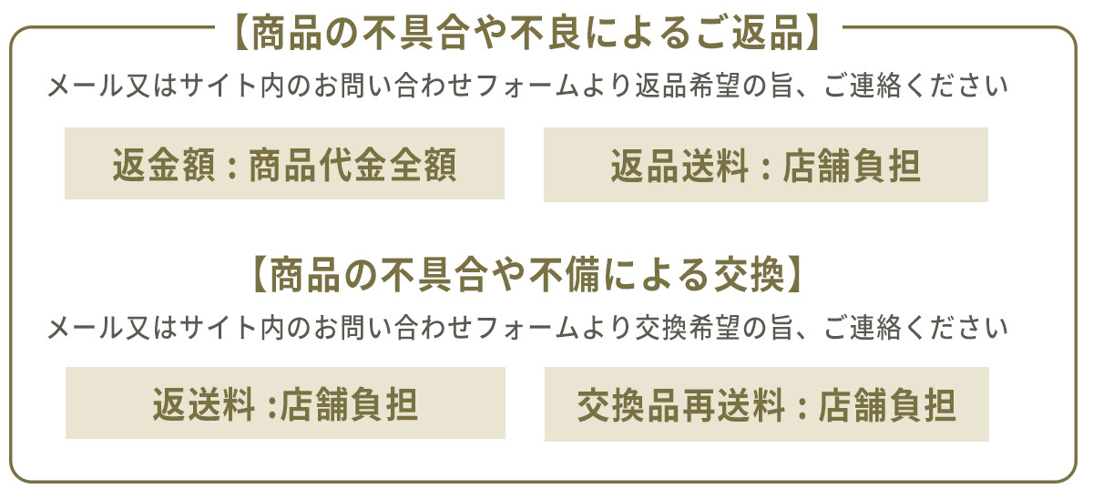 商品に不具合等ございました場合は商品ご使用の有無に関わらず、返品または交換にて速やかに対応いたします。