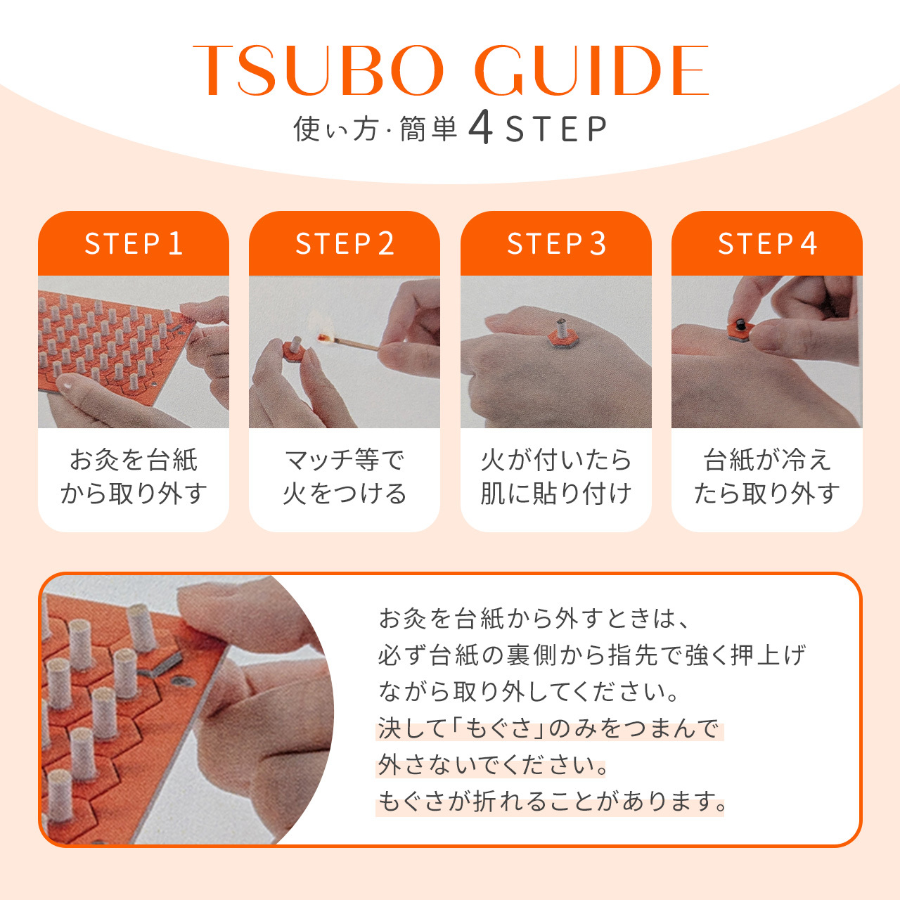 4. お灸が完全に燃え尽き台紙が冷えたら、そっと取り外します。