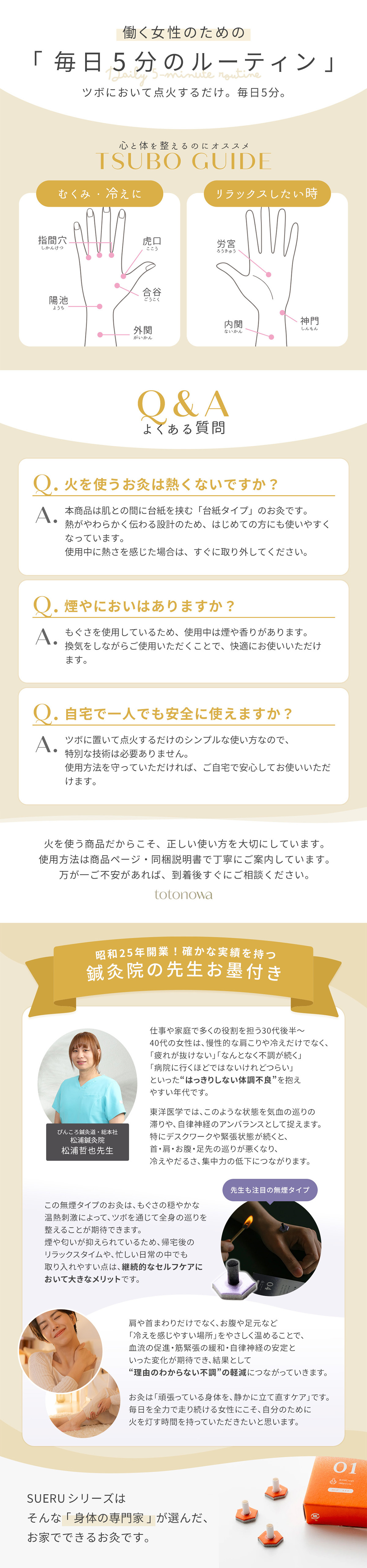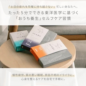 SUERUは、東洋医学に基づく「お灸」を、日々の暮らしに寄り添えるように「東洋医学の郷」がプロデュースするライフスタイルブランドです。歴史に裏打ちされた伝統的な素材と製法を用いて、身体の内から健康と美しさをお届けしたい、そんな思いから生まれたプロダクト。