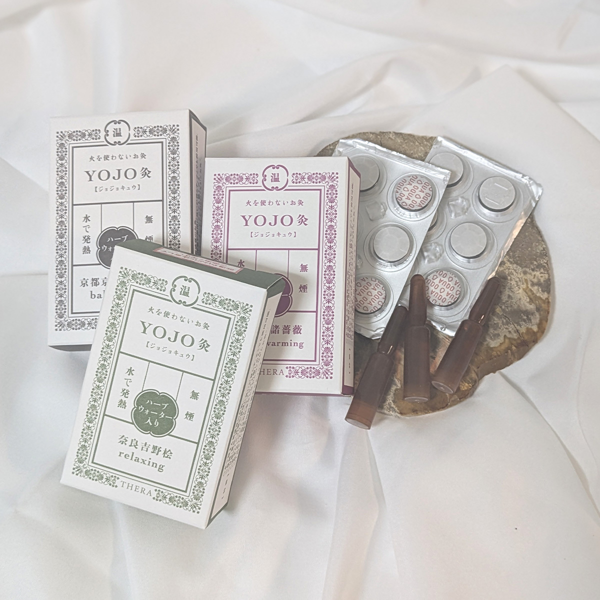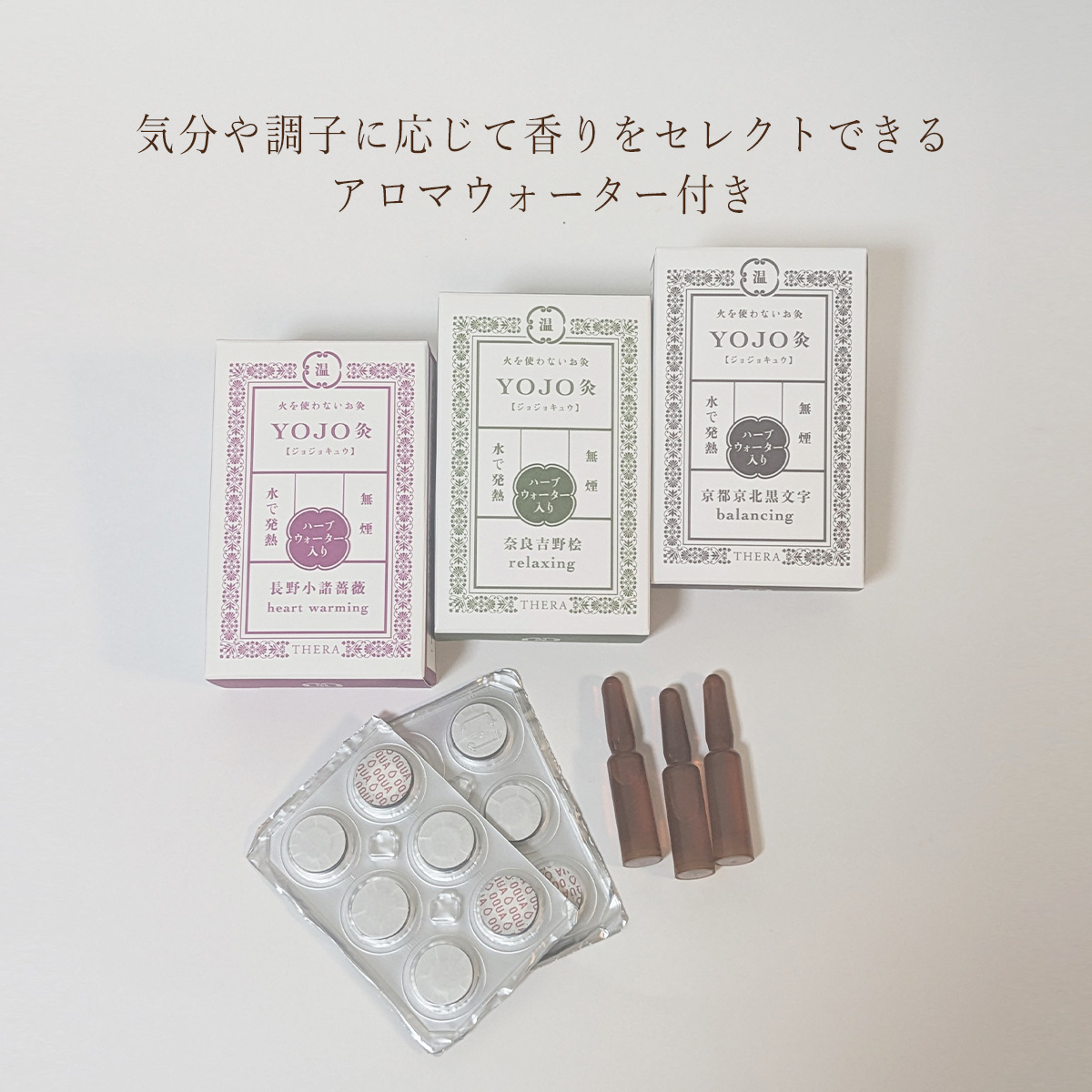 THERAのYOJO灸は火を使わずに発熱するので煙も立たず、お灸独特のにおいも気になりません。またお灸時間がより心地よくなるように、アロマを加えています。