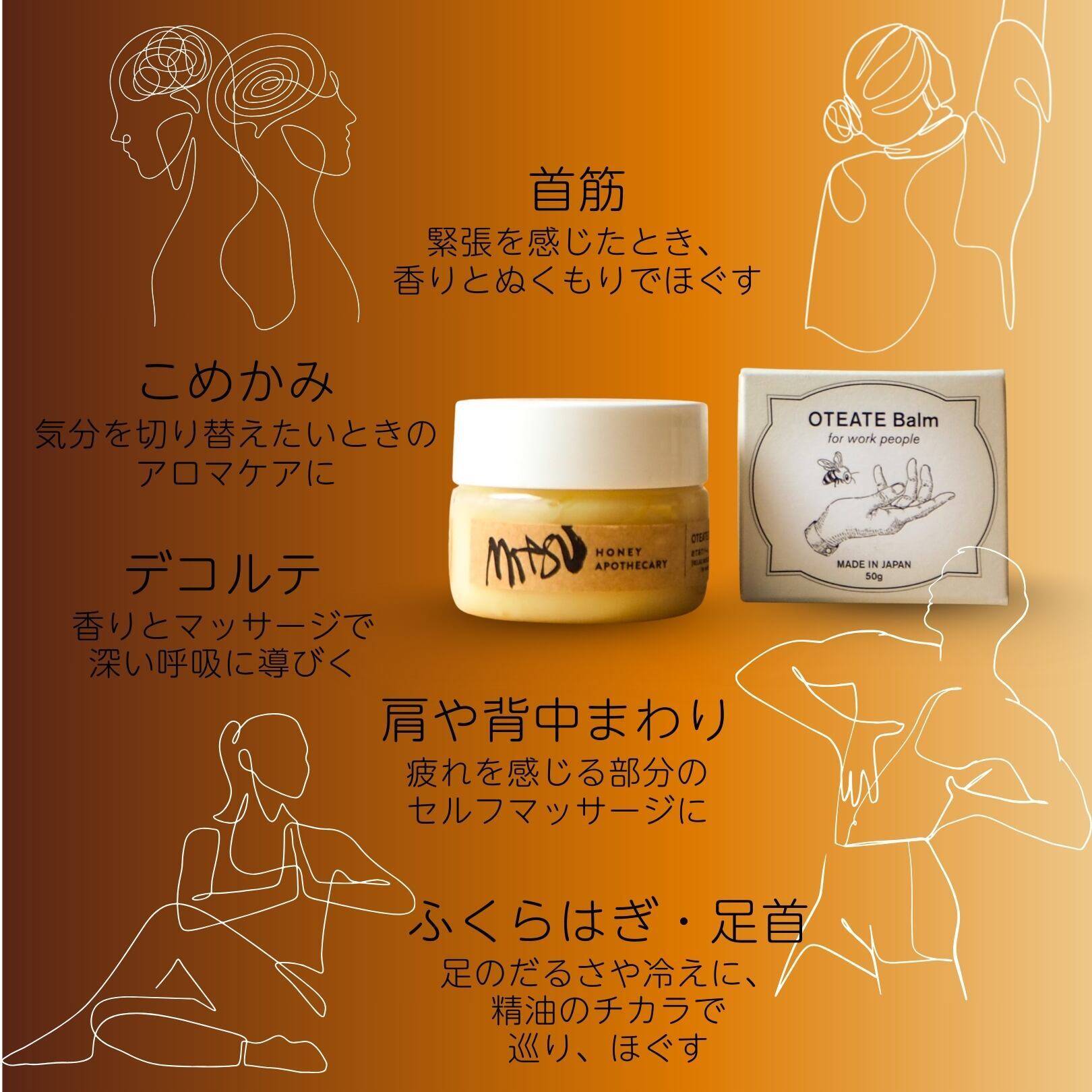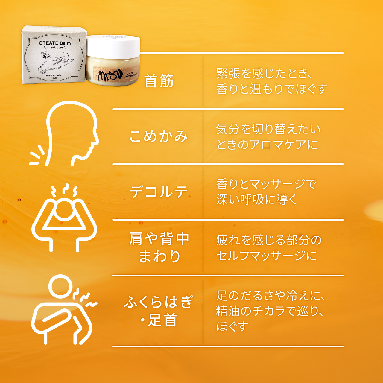 ハチミツ・蜜蝋・植物オイルのバランスが良く、肌のすべりがよくなるため、肩・首・脚などのセルフマッサージに適しています。